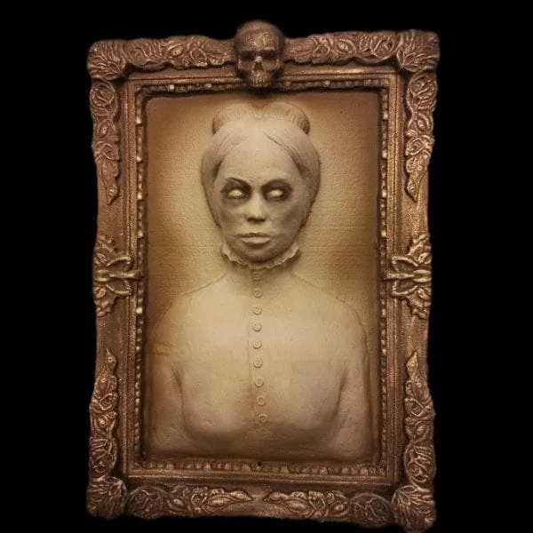 Eerie portrait is latex and foam and ready to hang. Â Approx. 36 in. x 24 in. x 12 inches deep.