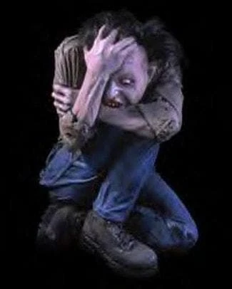 Cringing disturbed character. Realistic hair and film quality eye. Light, highly durable and weather resistant. Approx 22″x 28″x 22″.