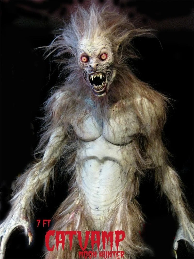 7ft wolfman/vampire style moonhunter, semi poseable flatback, custom glass eyes, and hand layed movie fx fur.