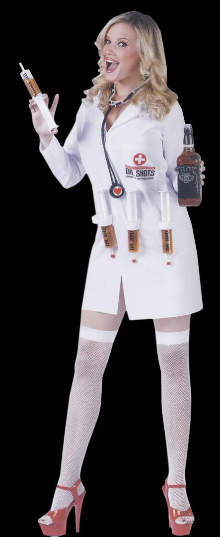 Lab coat with 4 syringe loops and screened logo front, hook and loop tab closure, 4 large syringes, and stethoscope. Great for parties! Bottle not included. One size fits women sizes 2-8.