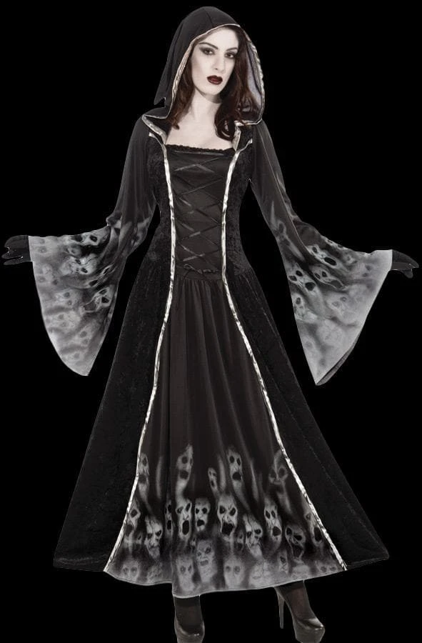 One of the spookiest and amazing adult costumes we have ever seen! Black dress with attached black hood and silver trims has wide sleeves and long skirt inset with printing of disembodied souls. Very striking! Gloves are not included. Fits female adult sizes 6-14.