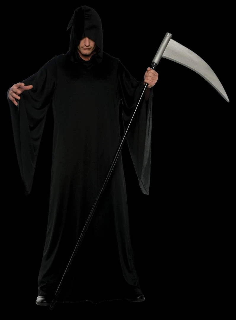 The Grim Reaper Halloween costume from The Horror Dome features a full body long black robe and an oversized hood. Classic drop sleeves add to the bone-chilling appearance of this robe. Designed to fit adults sizes 42-46, this instantly recognizable costume will be a hit at the next masquerade ball. Play a great practical joke on your older friends, trick or treat with the family on Halloween, or add an iconic character to your haunted house attraction. This fine black robe is also perfect for a number of dark priest looks. Perform a pagan sacrifice in style with one of these versatile robes.