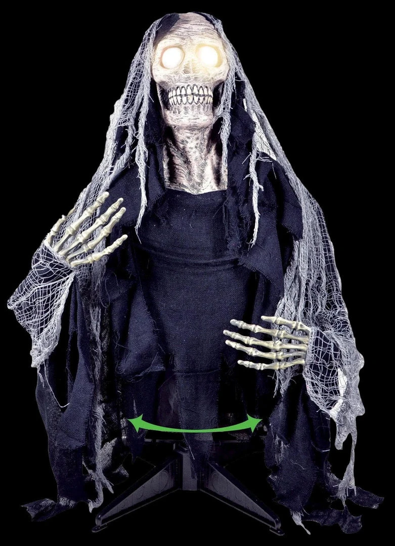 Half torso ghoul with lightup eyes and torso that turns back and forth. Requires 3 AA batteries not included. Sound activated. 32 x 54 x 6″