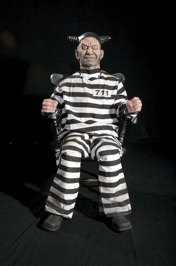 This condemned prisoner has attitude… taunting the crowd as the ‘switch’ is thrown. Electric Halloween Animatronic. You start the DVD player and then push the ‘switch’ at the right time. DVD with visual and audio effects included. Optional DVD player and Chair Not Included.