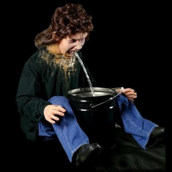 Puke is an all electric Frightronic prop. This vomiting man comes with his own bucket or you can add your own trash can to the scene. This is our affordable Frightronic version of our famous Vomit Barrel. A pump runs a steady stream of water through this latex and foam filled prop. Comes with ultra gross rights to downloadable soundtrack. Comes with bucket. Trash can not included, clothing may vary.