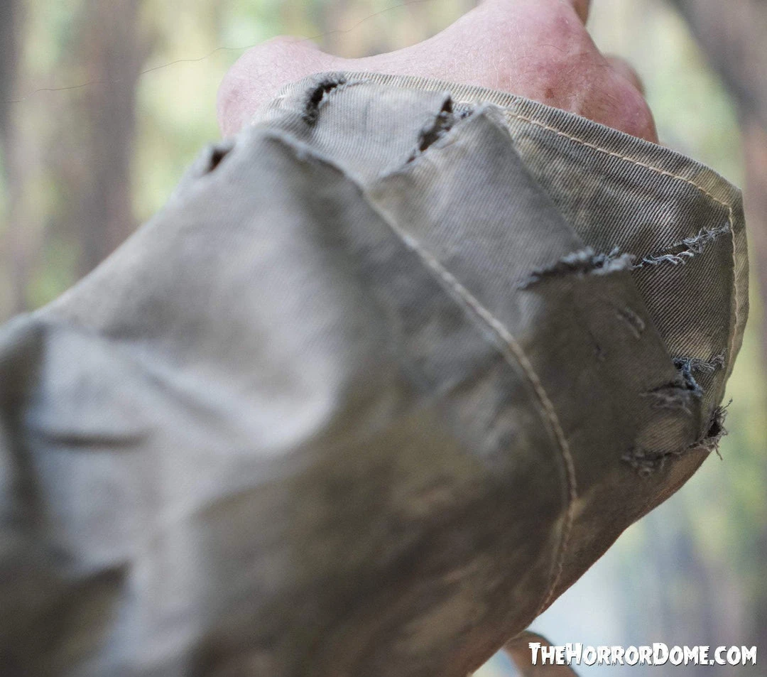 Hand Crafted Studio Jacket is hand-sewn with zippers, latch closures and sewn in lining. Much time has been put into this jacket to stress it out. Stained and ripped in the right areas this jacket is one for the Movies.