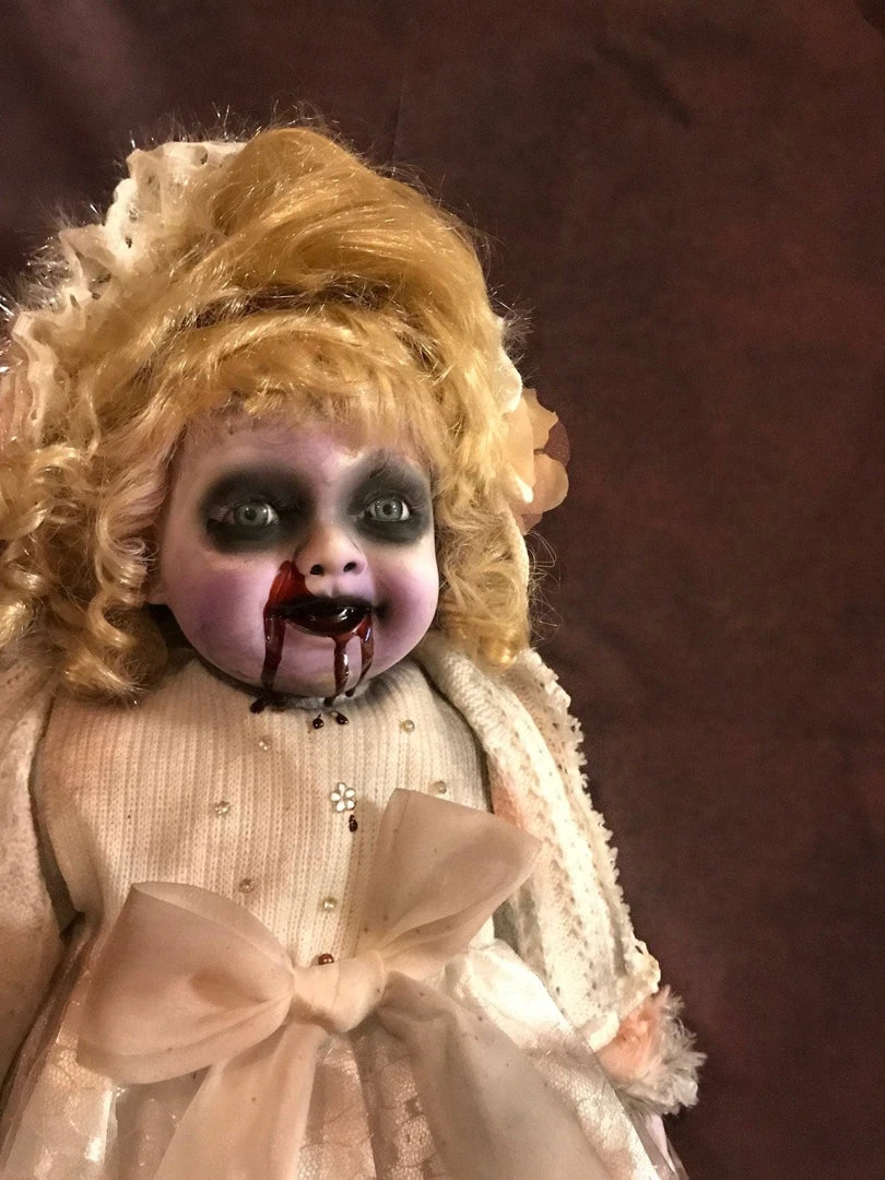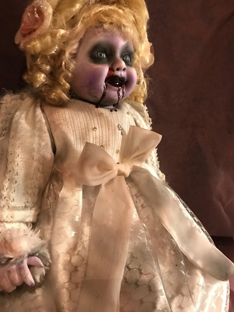 Doll has been repainted to look creepy, gothic, scary or spooky. Great as Halloween prop or just for creepy year round decoration.