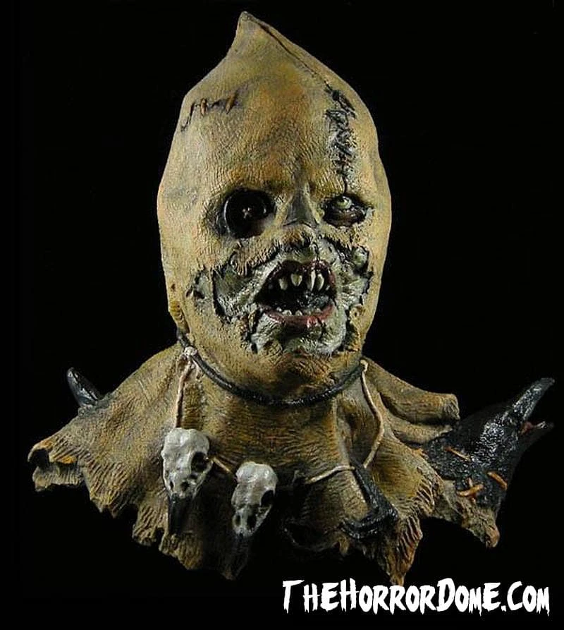 The Rotted Zombie Scarecrow Halloween mask from The Horror Dome is an original creation that’s made to meet Hollywood-quality standards. A classic scarecrow straight from Hell, this mask features a ferocious mouth of twisted teeth, a creepy necklace adorned with animal skulls, and a dusty and dirty-looking burlap head cover. Hand painted for by talented craftspeople for maximum realism, this frightening design will make an incredible costume, or a great collector’s piece.