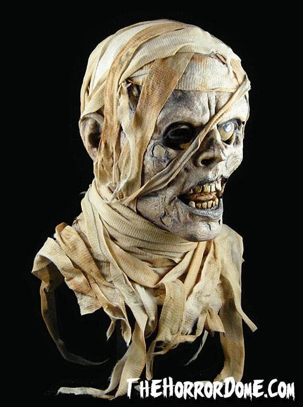 Unwisely awoken from his eternal deep sleep, The Mummy has risen and requires a feast. Cursed, embalmed, wrapped in bandages and sealed in a stone sarcophagus, this zombie-like monster is a unique form of the living undead. From terrorizing fortune seekers who look to pillage his tomb, to feasting on warm human flesh of innocent victims, this fierce pharaoh can only be stopped by reading a from the book of the dead. Now, how’s your ancient Egyptian? This Mummy Halloween mask from the talented artists and craftspeople at The Horror Dome is an over the head design that will look frighteningly realistic with a body wrapped in gauze or tattered rags. A great collector’s piece, these premium masks are hand painted and exceptionally detailed. You’ll be all the rage at the next costume party, and scare the socks off the guests at your haunted house or neighborhood trick or treaters.